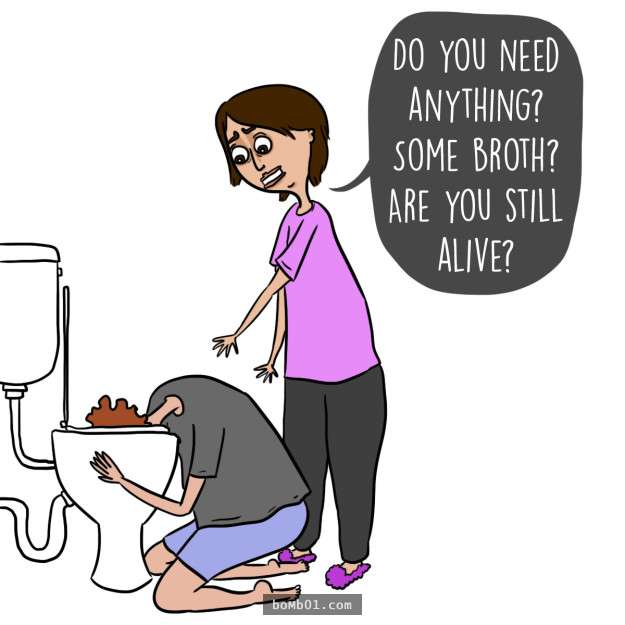 ▼9. 第一次看著對方吐卻不覺得噁心,只想為他/她做點什麼。「你需要什麼嗎?你想喝雞湯嗎?你還活著嗎?」(內心小劇場)
