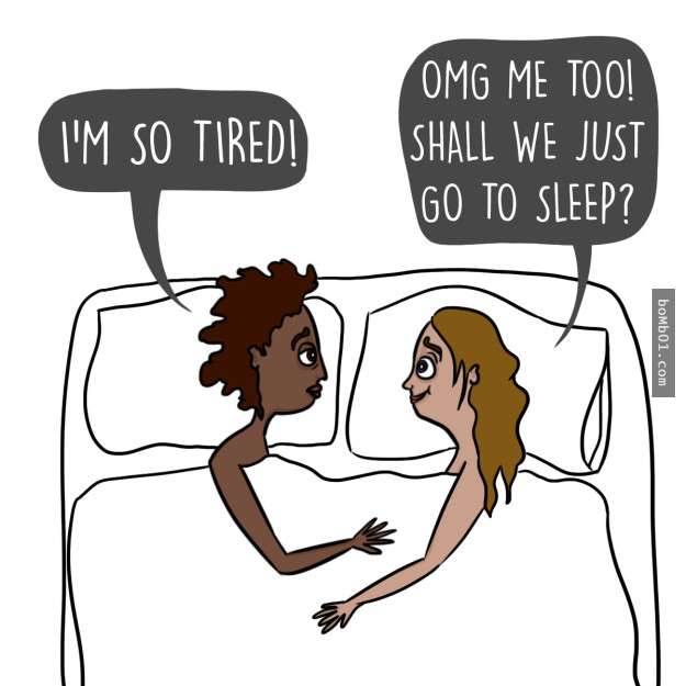 男:「我好累!」女:「我的天啊,我也是耶!我們一起睡吧。」
