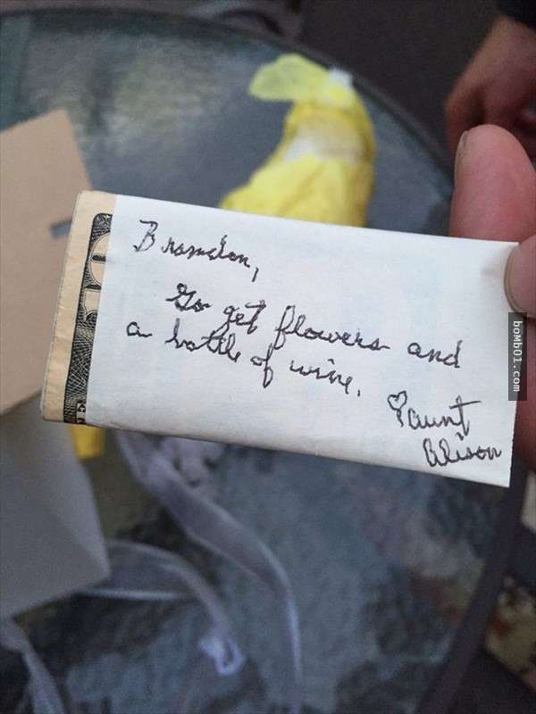 ▼給布蘭登的信中也同樣夾帶著現金,寫著「請用這些錢拿去買一束花和紅酒。」