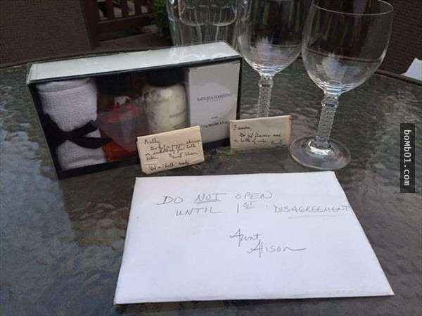世界上沒有一對情侶或夫妻從來不會起爭執,吵架後該如何重修舊好以及從中學習才是維繫感情的關鍵,這對來自美國的夫妻在九年前成婚,他們在婚禮上收到一份來自姑婆的神秘盒子,上面還附著一張「在第一次吵架前都不要打開」的紙條,9年後他們終於打開了那個盒子,內容物讓所有人受到極大震撼。