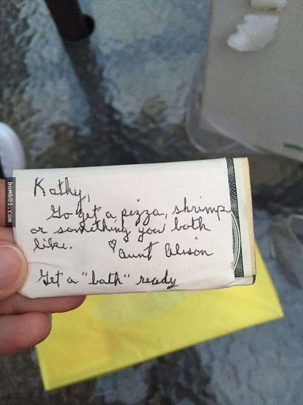 ▼給凱西的信中夾帶著現金,寫著「請用這些錢買些披薩和蝦子,或著是你們兩人喜歡吃的食物,然後準備好泡澡水。」