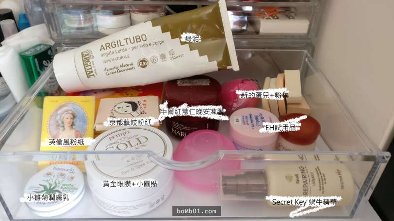 ▼照片中最底層的G樓都是平常比較用不到的東西,例如有粉的吸油面紙、媽媽不要的晚安凍膜、新的蛋蛋跟粉撲等。