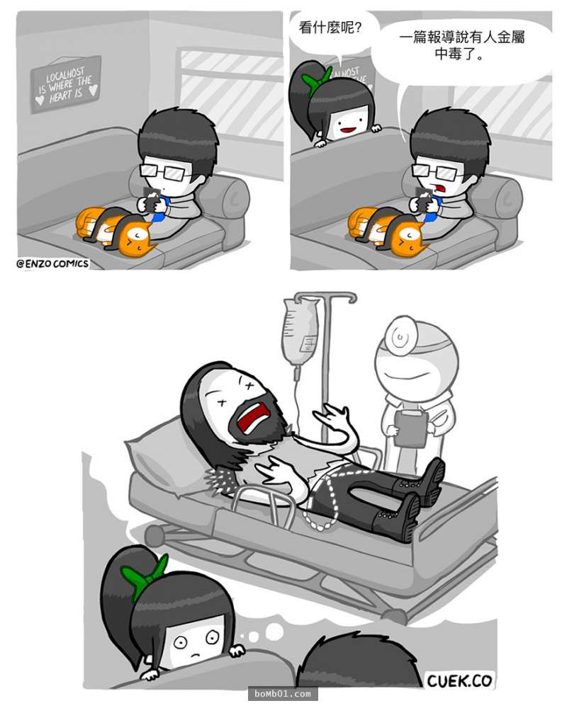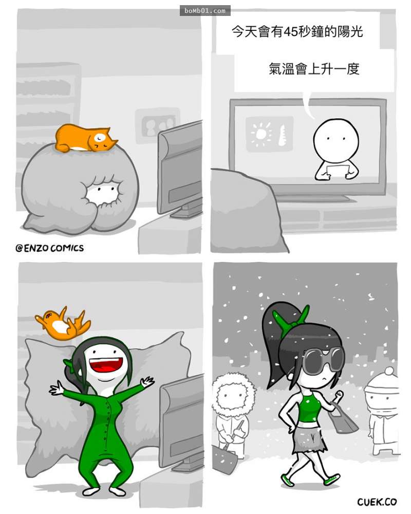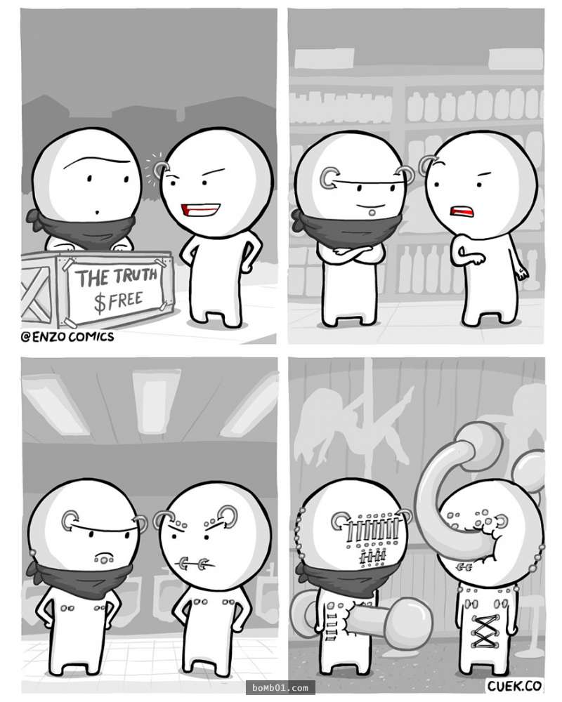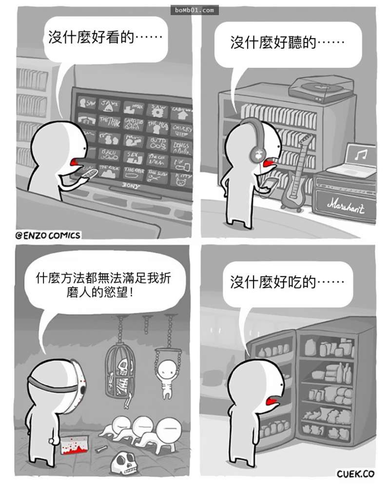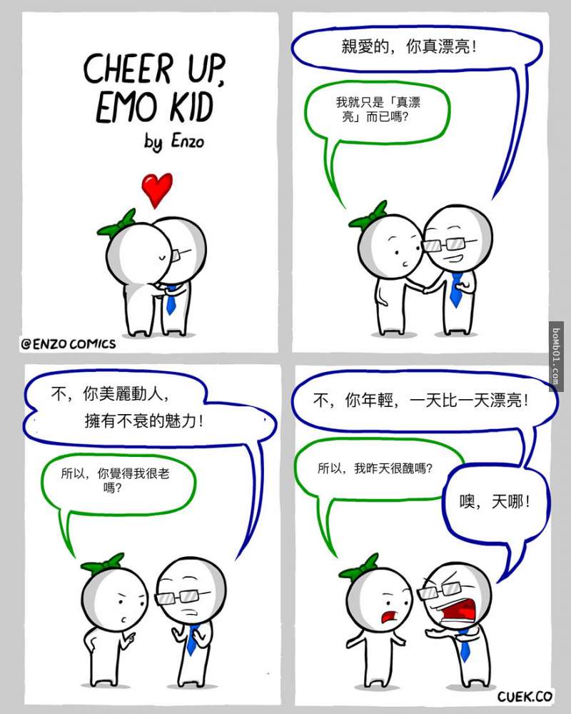 2016年11月25日網路上有很多趣味漫畫,下面這些是插畫家Enzo的《Cheer Up, Emo Kid!》。這些漫畫內容包羅萬象,從人際關係、兩性問題,到交友生活。不管你的職業是什麼,平時的愛好是什麼,都能夠從中找到共鳴。它們會讓你的嘴角忍不住失守!