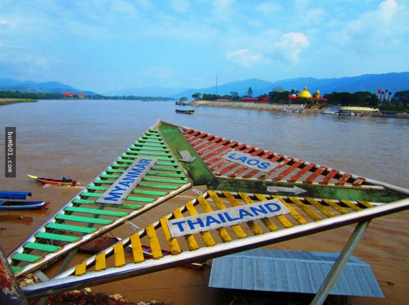 ▼泰國、寮國和緬甸:這個可愛的路標就是它們的邊界。