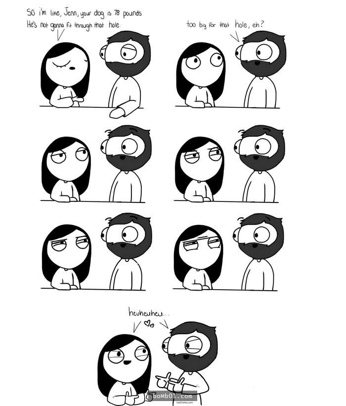 ▼「Jenn,你的狗狗78磅那麼重已經不適合它的狗洞了」 「它的洞太小了?」 就在戰爭一觸即發時,連個人突然搞怪化解一切尷尬,這就是情侶的默契。
