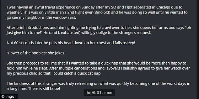 相信大家都聽說過,搭飛機時最怕的就是有小朋友在旁邊,因為愛玩愛鬧又體力充沛的孩子通常都會影響到別人的休息,所以被許多人排斥。然而這名爸爸也萬萬沒有想到,他居然會在疲憊於應付小寶寶的時候,得到了一位好心陌生人的體諒和幫助,這樣的事真是太有愛了,希望我們的社會以後也會有更多像這位女士般的善心人,願意給別人多一點體諒,讓我們的世界充滿愛與正能量!