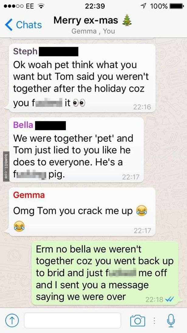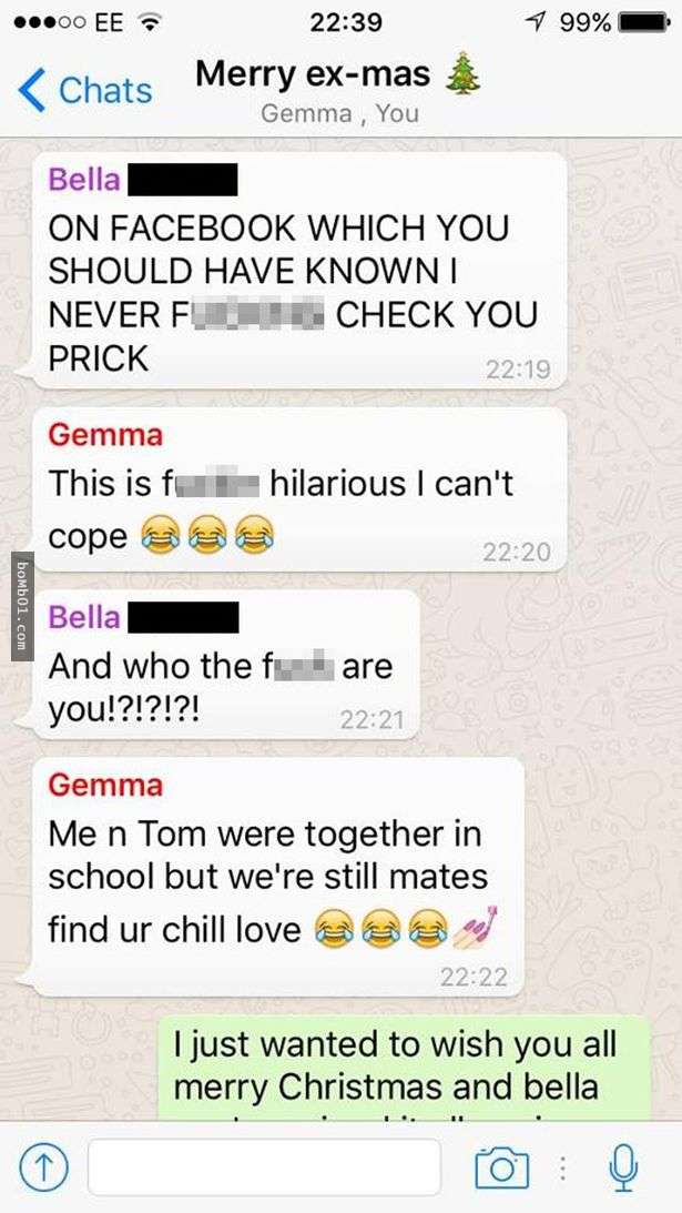 2016年12月29日分手後到底能不能做朋友? 每個人的想法都不一樣。如果你曾好奇把前任們聚在一起會發生什麼事,那正好找到答案。下面這名叫做Tom的男子突發奇想,聖誕節前把前女友們加入同一個聊天室,結果毫不意外,果然引發了一場恐怖的世紀大戰。