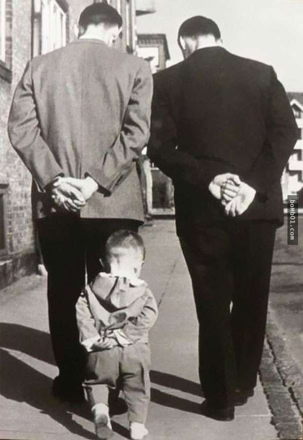 ▼這個小男孩正在學爺爺和爸爸走路的模樣。