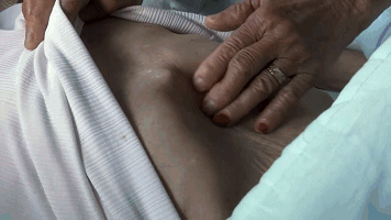 ▼爺爺不舒服躺在床上的時候,奶奶就幫他輕輕按摩肚子,想要減輕他的痛苦。