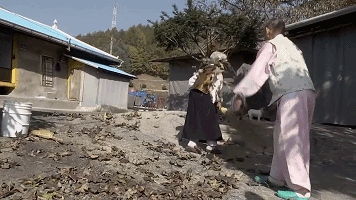 ▼他們像小情侶一樣打打鬧鬧,清掃院子裡的落葉也不覺得無聊。