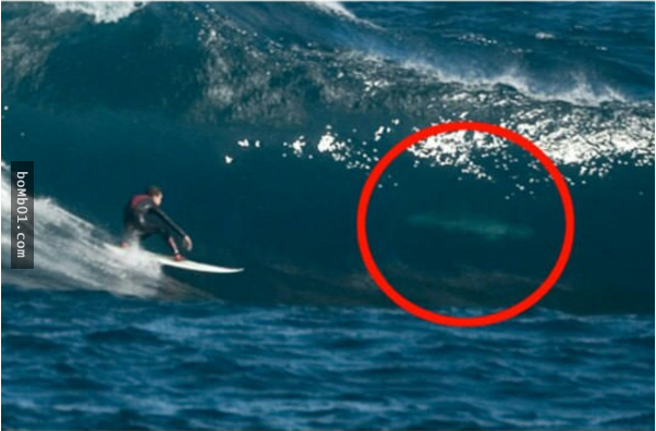 ▼衝浪時一定要提高警惕,因為鯊魚可能就在你身邊。