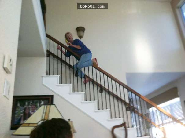▼9. 70歲奶奶童心未泯地從樓梯扶手上滑下來,手上還拿著一根香蕉!(奶奶到底想幹嘛啦XD)