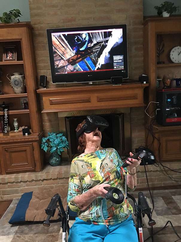 ▼7. 這位網友96歲的奶奶正在進行人生中首次的VR體驗,看來她玩得非常開心呢!