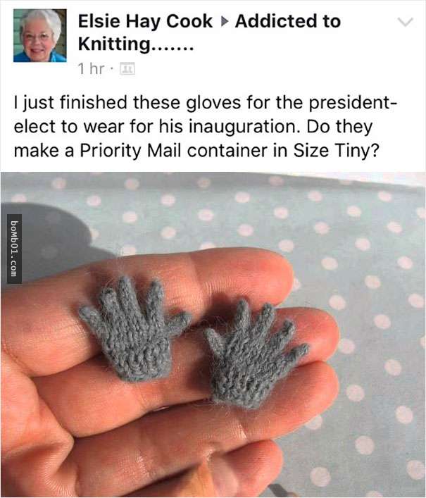 ▼2. 奶奶:「我剛做好了這個手套要讓新總統在就職典禮上配戴。他們有迷你尺寸的快遞郵件包裹嗎?」竟然連奶奶也在酸川普手很小!(大笑)