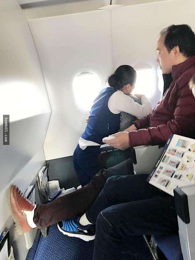 ▼為了防止他在飛機降落過程中害怕,莊雪丹半跪在他面前,左手穿過安全帶緊握著對方的手,右手則環抱住對方安撫他的背,直到15分鐘後飛機順利降落才停下。