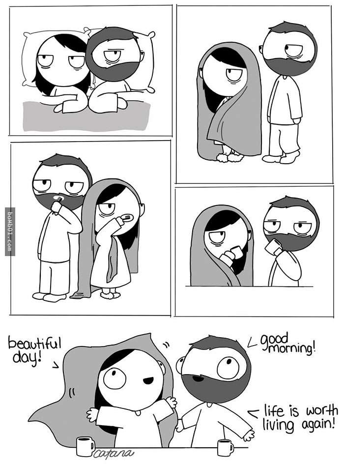 ▼18. 女友:「美麗的一天!」男友:「早安!人生又再次充滿意義了!」