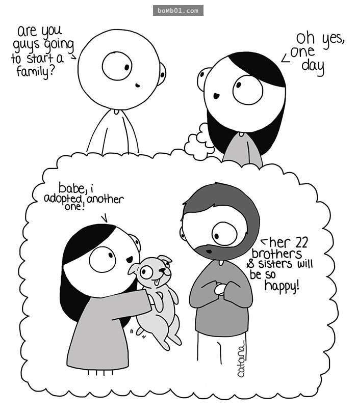 ▼7. 路人:「你們兩個會共組家庭嗎?」女:「會啊,總有一天。」女生心想:「寶貝,我又領養了一隻!」男友:「他另外22個哥哥姊姊一定都會很開心!」