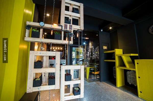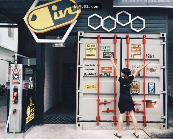 門口以醒目的貨櫃風為設計的蜂巢膠囊旅店,內部設計以工業風為主,整面牆繪製的可愛蜜蜂也成為館內最好拍照的特徵。