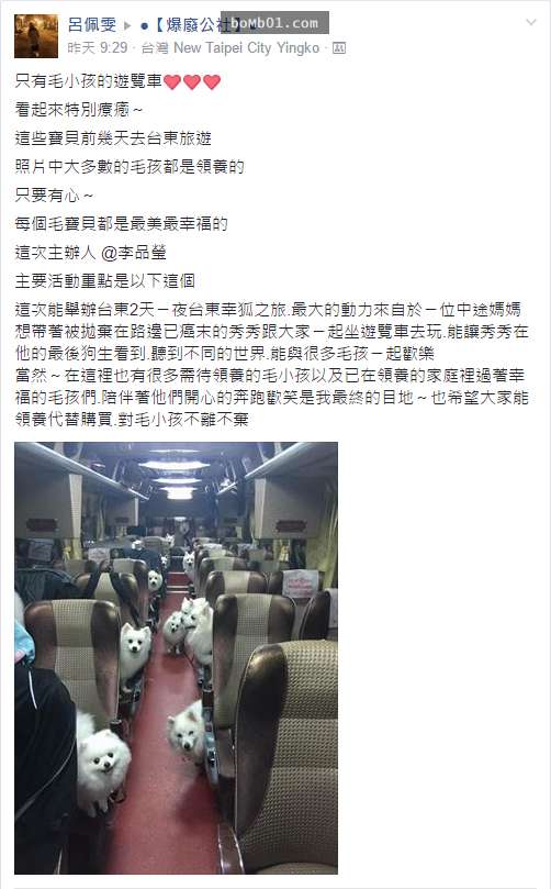 ▼這趟旅程其實是由多位愛媽一同策劃的,遊覽車內的狗狗全都是遭到前主人遺棄後被領養回來,當中還有一隻名為秀秀的癌末毛孩剩下的日子已經不長,所以為了給這班毛孩們一個難忘的快樂回憶,愛媽們便帶著可愛的狗狗出外走走,讓牠們可以在短暫的生命裡多看看這個世界,讓牠們感受到歡樂的喜悅。