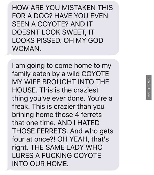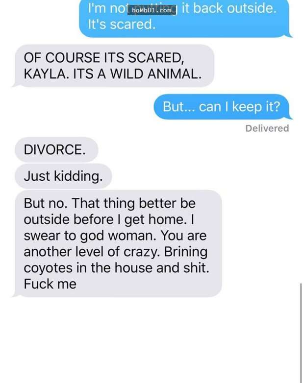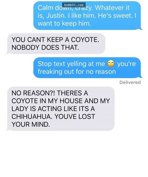 ▼凱拉說:「冷靜點,不管牠是什麼,賈斯汀。我喜歡牠,牠很可愛,我想要飼養牠。」丈夫說:「妳不能養一隻野狼,沒人這麼做。」凱拉回:「不要在訊息裡罵我了啦,你根本是不講道理在亂發脾氣啊!」丈夫說:「我不講道理?!我的屋子裡有一隻野狼,但我的女人卻把牠當作一隻吉娃娃在對待,妳才是喪心病狂!」