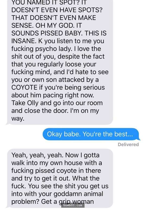 ▼「帶著奧利進房門躲起來,我正在回家的路上了。」丈夫說,凱拉也回道:「好的寶貝,你最好了…」這位僅存一絲理智的丈夫說:「對對對,我現在要進家門,裡頭還有一隻火大的郊狼,然後我要把牠趕出門外。去他X的!妳看到妳造成的動物災禍了嗎?有點常識,女人。」