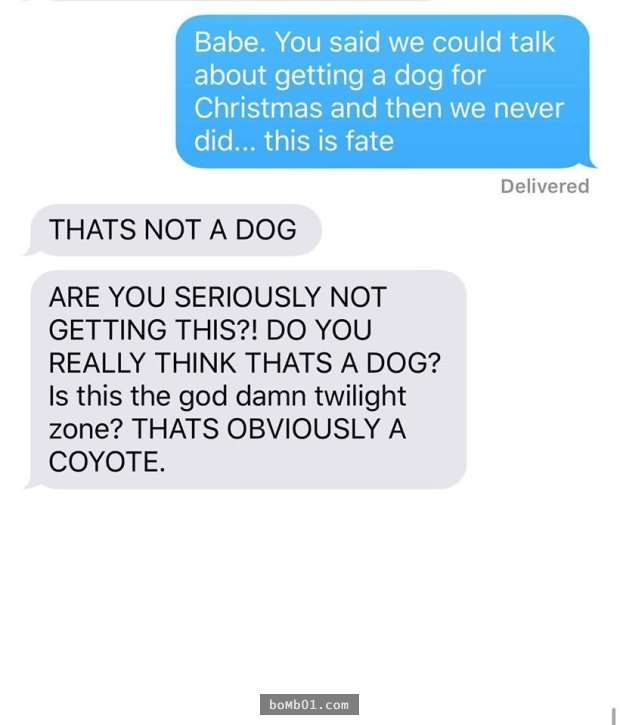 ▼凱拉說:「寶貝,你之前一直說我們可以在聖誕節領養隻狗啊,這就是命運的相遇。」丈夫不耐其煩地解釋說:「這、不、是、一、隻、狗」、「妳是真心不了解嗎?妳真的覺得這是隻狗?這兩者有這麼該死地難分辨嗎?這明顯是一隻郊狼!」