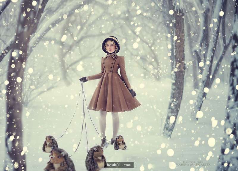 ▼雪花、野生動物、精緻複雜的服裝、顏色鮮豔的道具……這些都讓Margarita的作品有了不一樣的感覺。