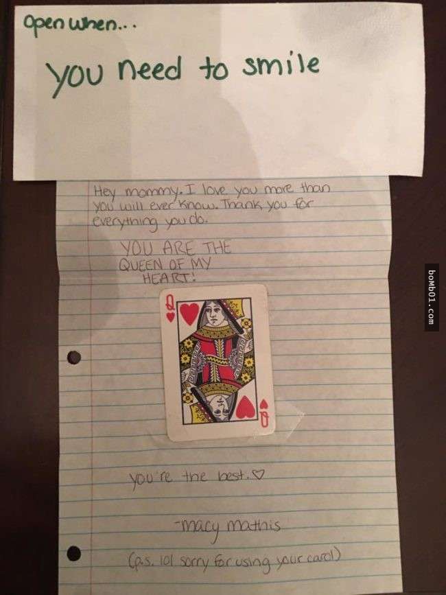 ▼這封則是在辛蒂心情不好,需要笑容時打開的。貼心的梅西黏了一張皇后Q,寫著:「媽媽,我對妳的愛遠超過妳的想像,謝謝妳所做的一切,妳就是我心中的皇后!」