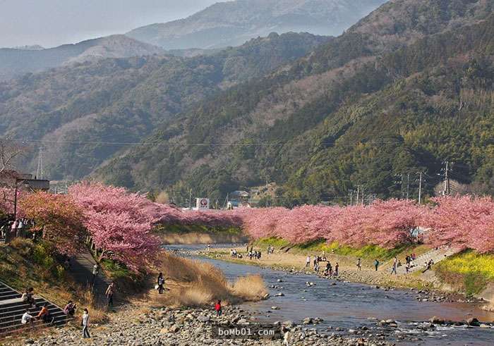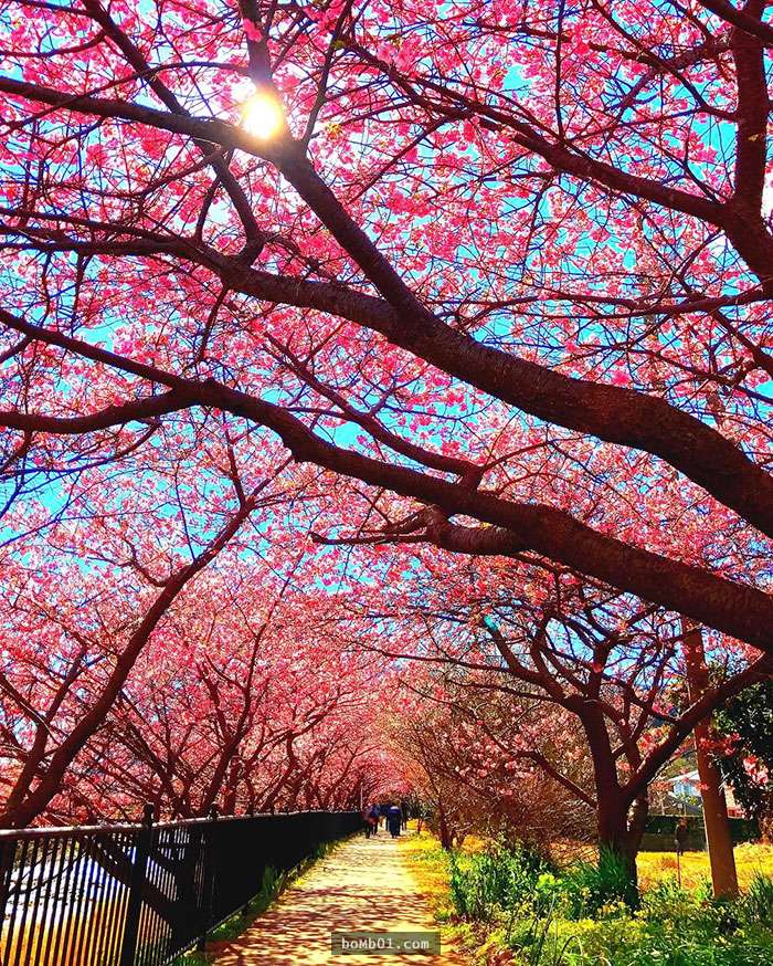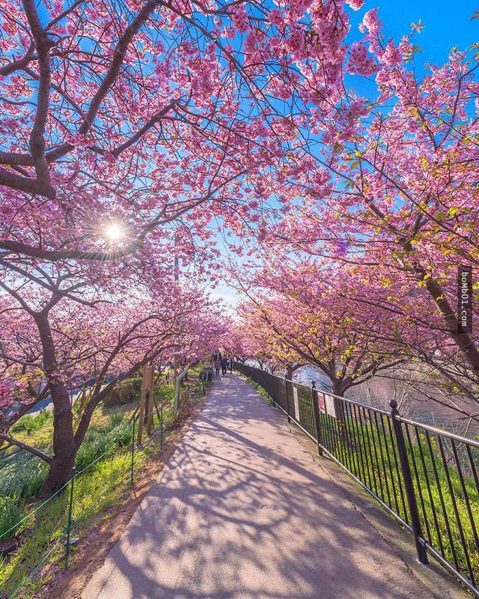 2017年02月18日日本東京的櫻花大概在3月下旬、4月上旬開放,但東京近郊的河津地區卻早早迎來了春天。這裡大約有8000棵櫻花樹,開花時節非常壯觀,特別是河岸的那些櫻花樹,粉色花瓣與清澈的河流交相輝映,置身其中,彷彿做了一個甜美的夢。