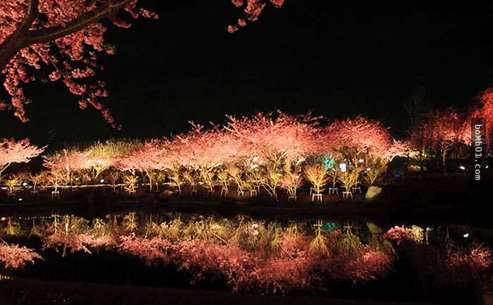 ▼晚上,樹木被燈光照亮,櫻花倒映在河中,非常美麗。