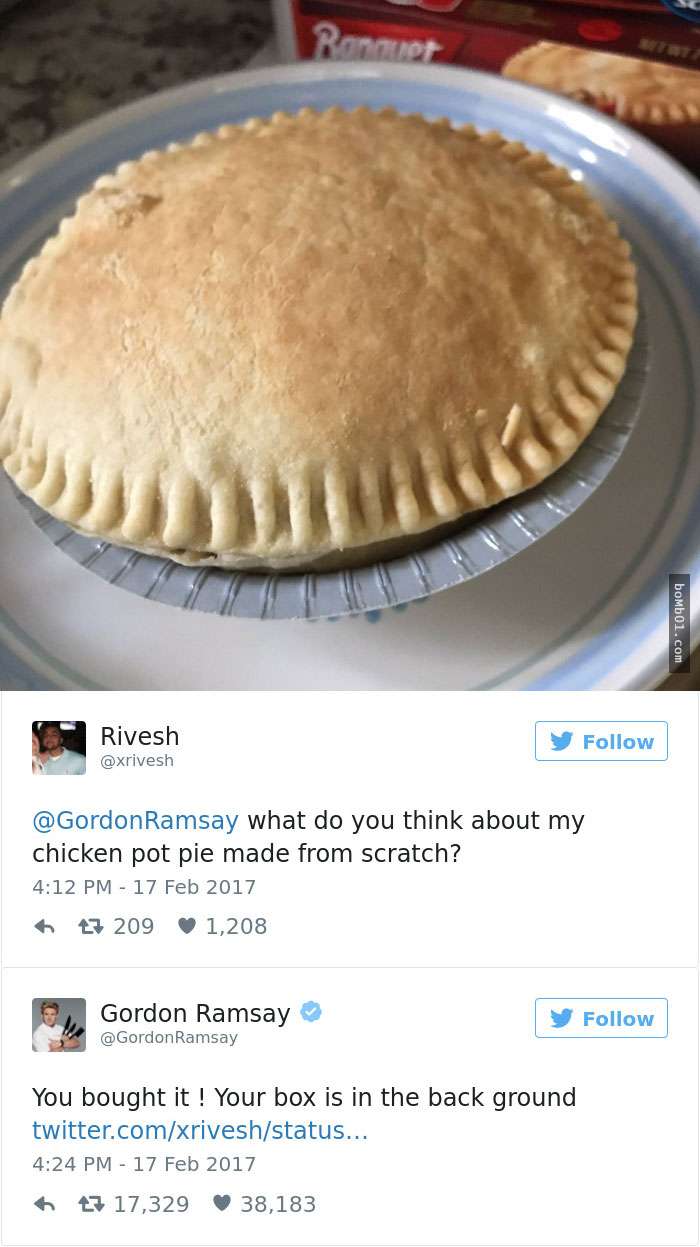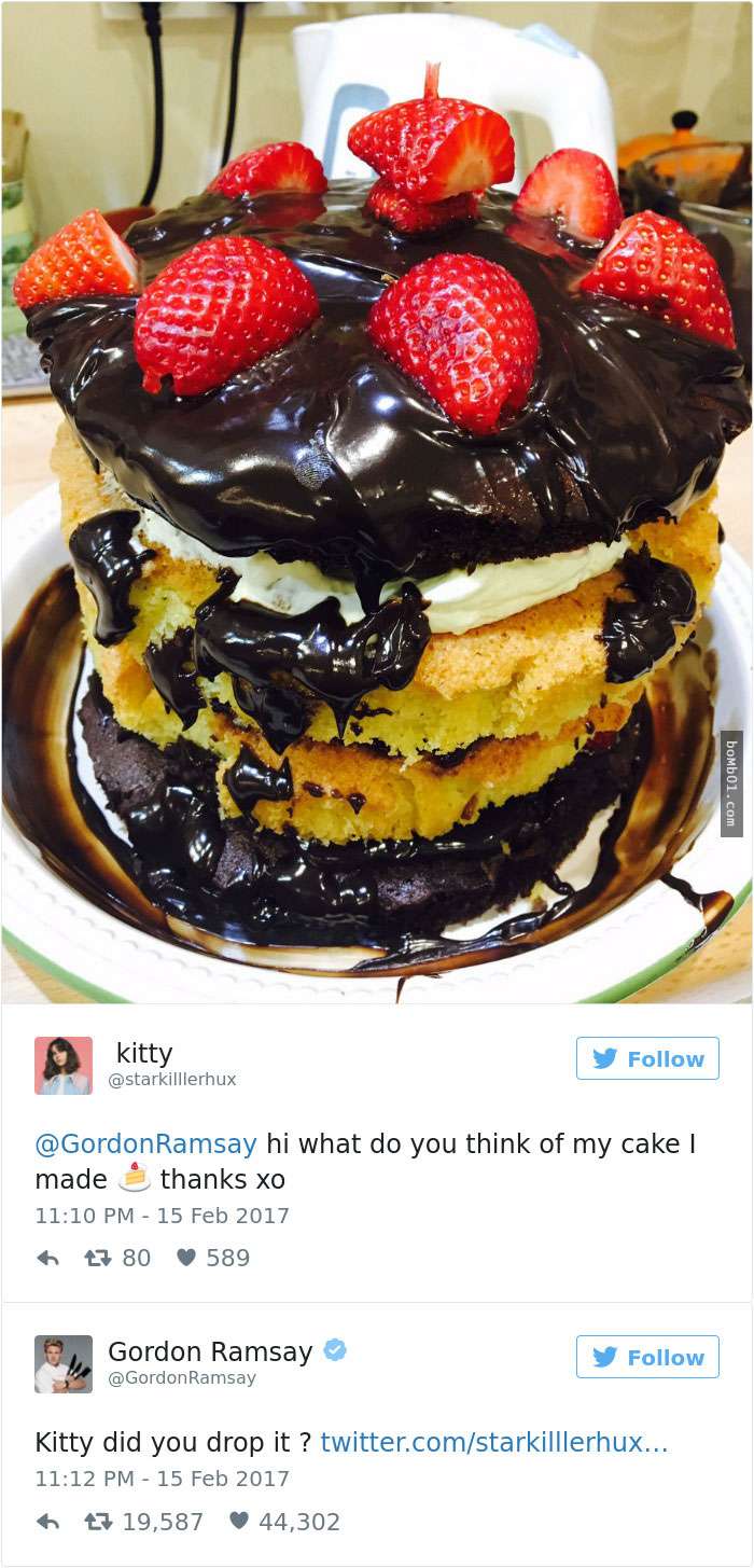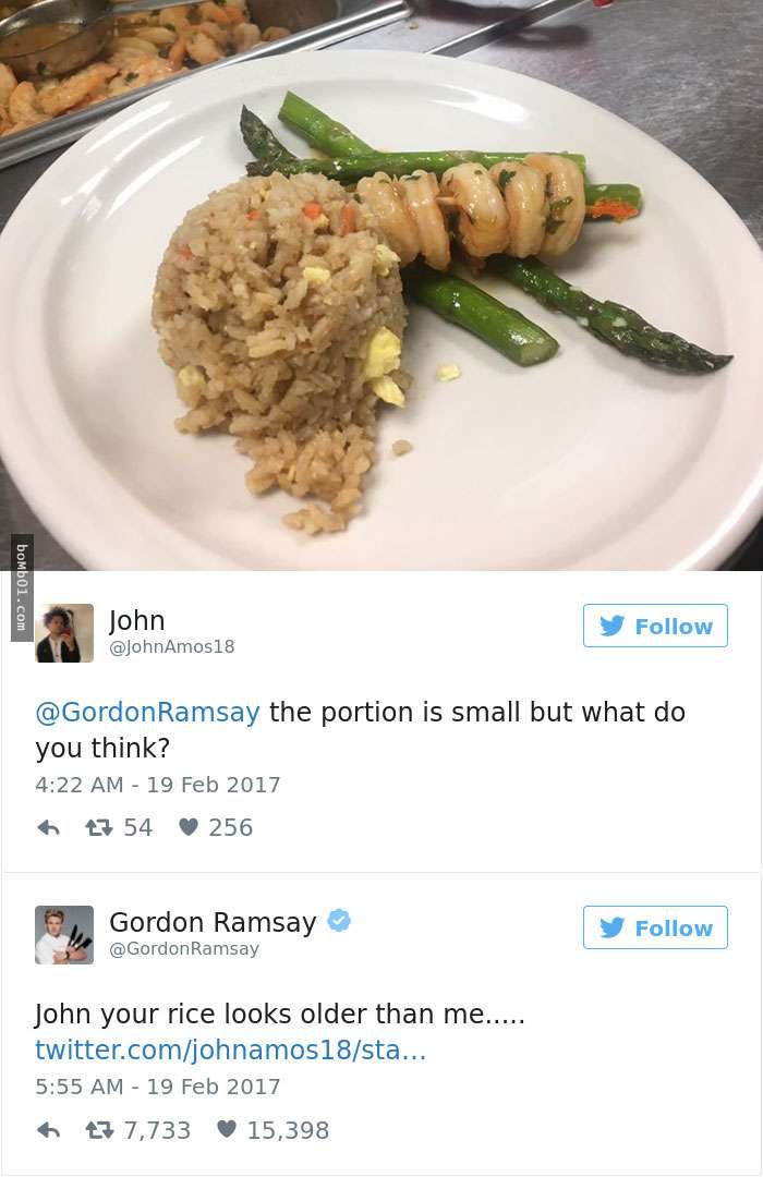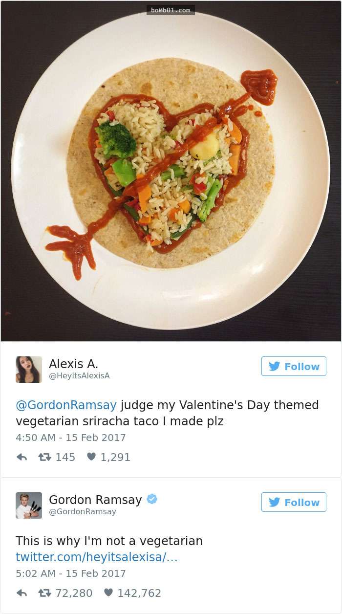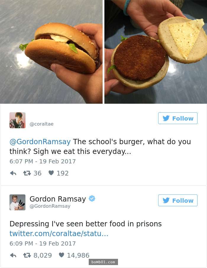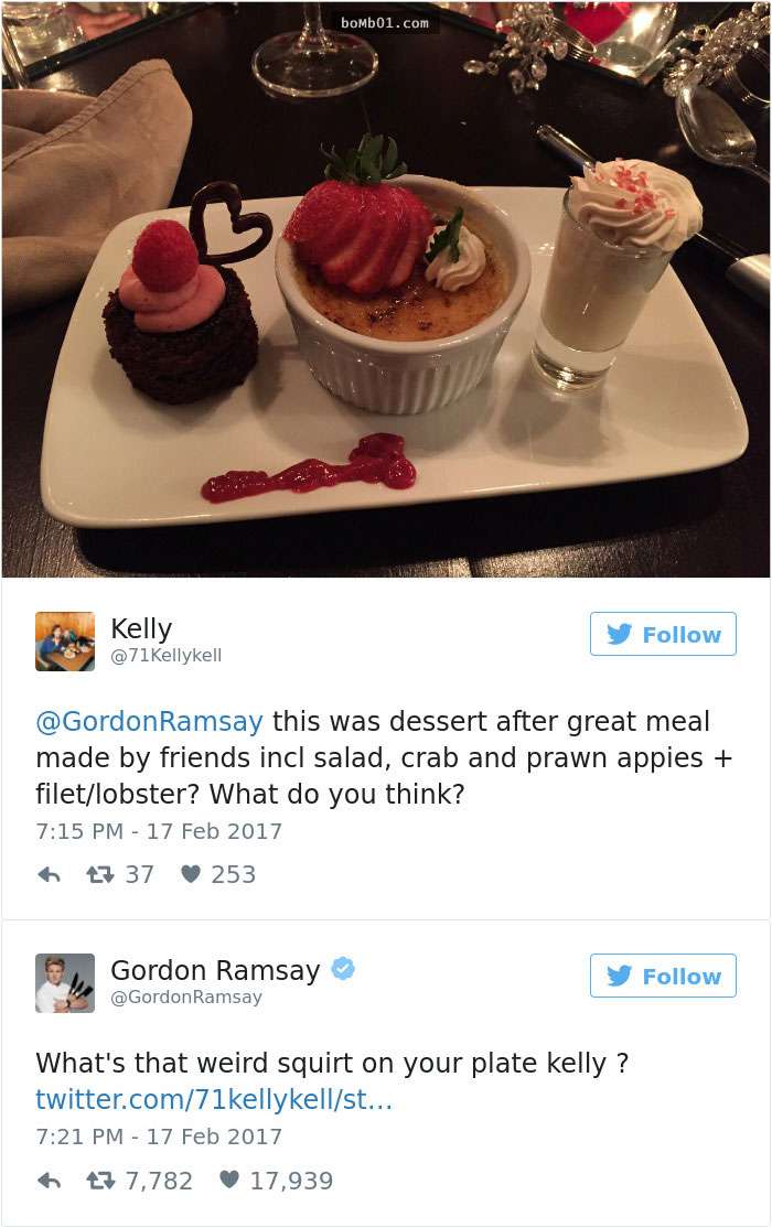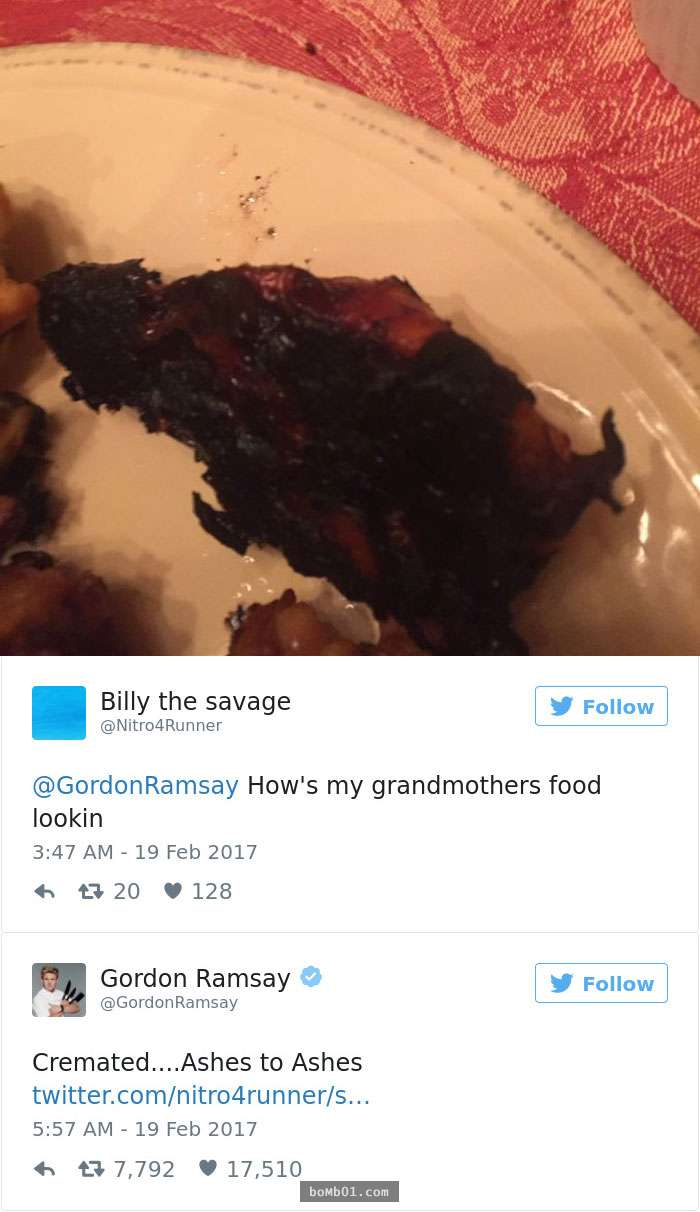 2017年02月24日英國米其林三星主廚高登蘭姆齊(Gordon Ramsay)是很多人心中的「廚神」。他言詞犀利,很有個性,所以大家把自己做的料理照片分享給他看時,沒幻想得到正面積極的鼓勵,但粉絲們顯然還是低估了他的毒舌程度,很多人的主廚夢就此破滅了。