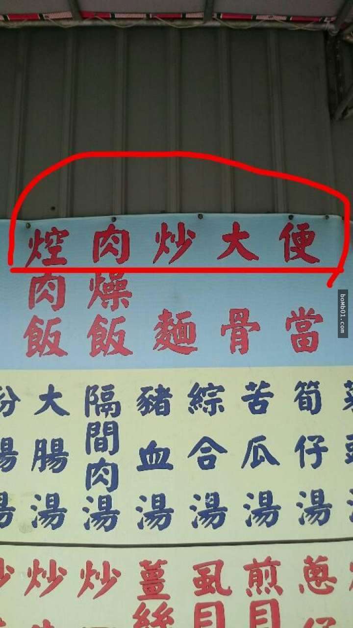 ▼菜單上寫著「焢肉飯、肉燥飯、炒麵、大骨、便當」,都是很常見的菜色,沒什麼問題。不過橫著看就有趣了,第一行竟然是「焢肉炒大便」!