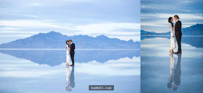 ▼美國博納維爾鹽湖:這個鹽湖的面積為5萬2000平方公里,雨後的湖面如同無波的鏡子,倒映著藍色的天空。現在這裡是有名的婚攝地點,去玩的話還能看到不少情侶拍照呢。