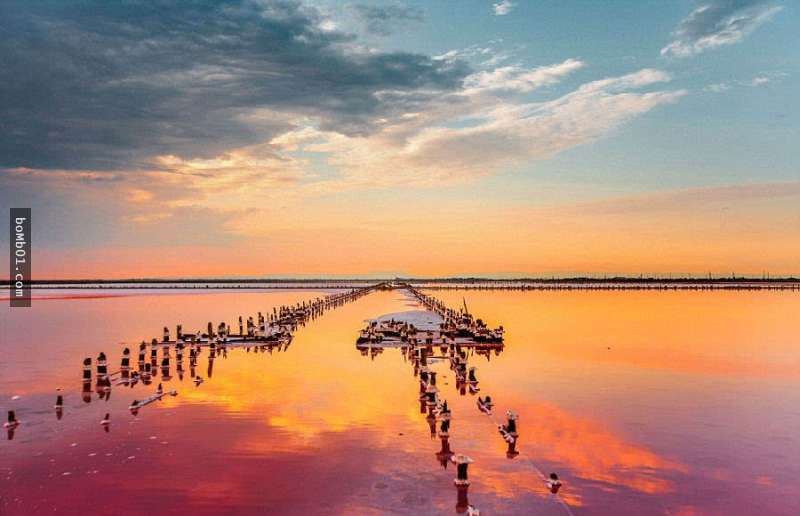 ▼克里米亞錫瓦什湖:這個湖又被稱為「腐蝕之海」。蘇聯時期把它當作鹽礦。這個湖的水不深,但含鹽率相當高,湖里還有噬鹽菌的藻類,呈現大片玫瑰紅,與藍色的天空項映照,不用修圖就是魔幻大片。