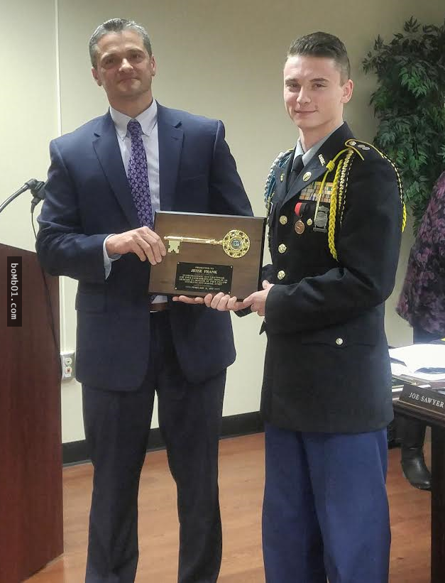 ▼前日傑西身著他的大學儲備軍官訓練團(ROTC)從市長 Bill Pruitt 手中接下了英勇市民獎,他機警的反應及英勇的行為受到全體市民的讚揚。