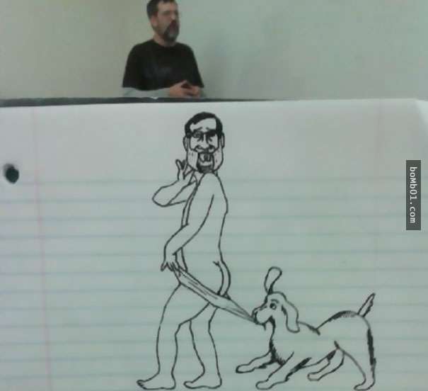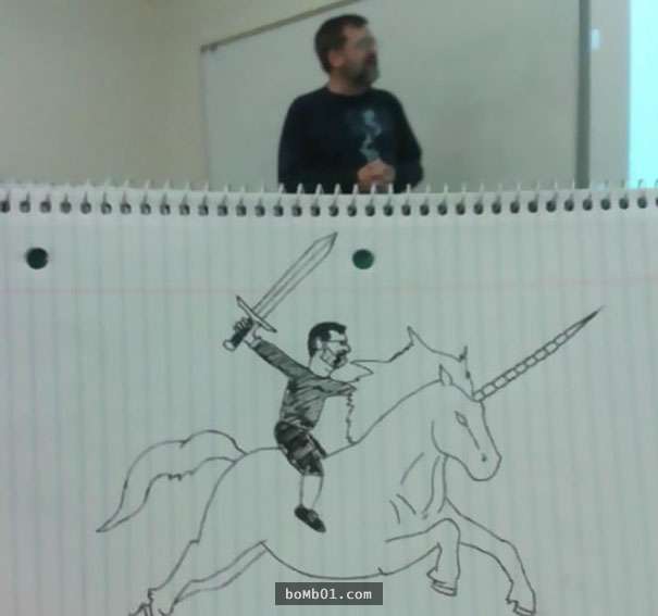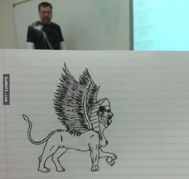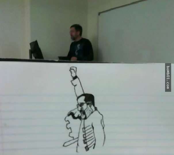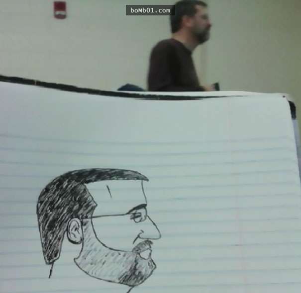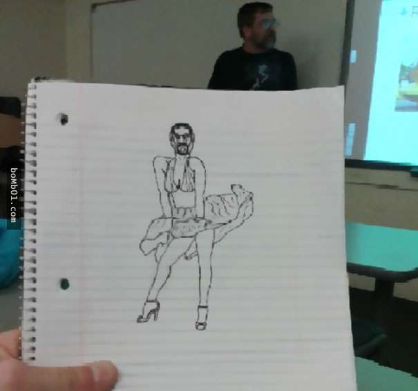 2017年03月08日每個人打發時間的方式都不一樣。有人會小睡片刻,有人會玩手機,下面這名網友則喜歡塗鴉。他感覺商業管理課的教授講課太枯燥,所以發揮想像,讓他成為了塗鴉的主角。