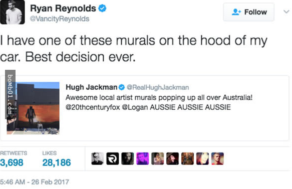 ▼這已經不是兩人第一次隔空調侃,不久前,Hugh Jackman在澳洲看到了《羅根》的壁畫,忍不住分享到網路上。