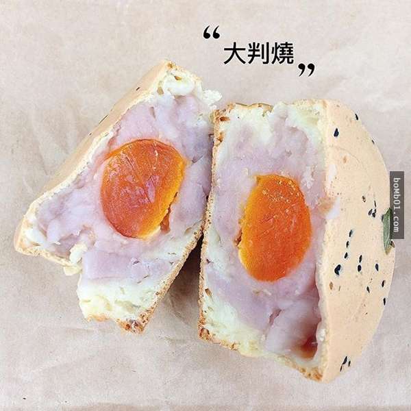 ▼大判燒中的人氣口位就是獨特的「芋頭蛋黃」!從切面就可以看到,裡頭包著快要爆炸的鬆軟芋泥餡,搭配一整顆金黃飽滿的鹹鴨蛋黃,芋泥還保有芋頭顆粒的口感,難怪買過的人都想再吃!