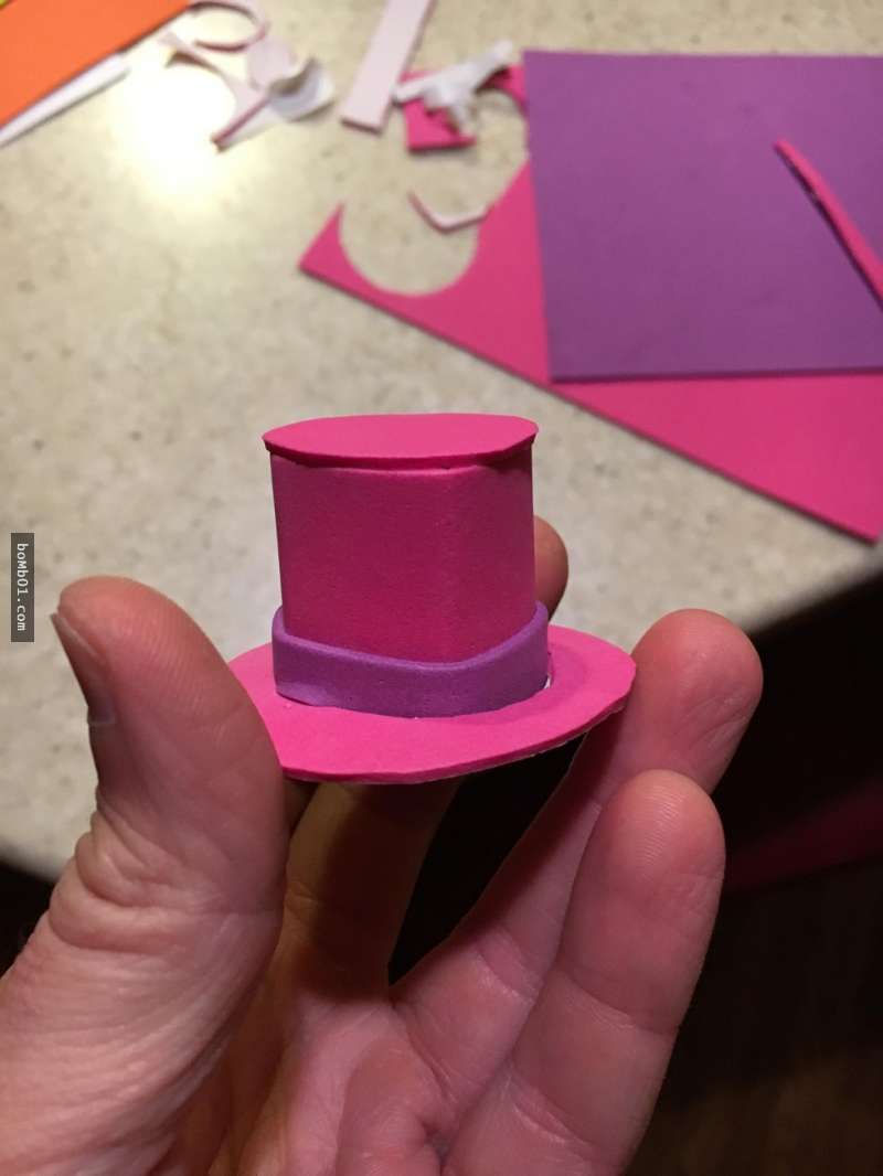 ▼他巧手製做了一個粉紫相間的小帽子,他說:「我決定走入蟾蜍帽子的世界,來幫助這個小傢伙。泡棉紙對蟾蜍來說應該是沒什麼損害的。」