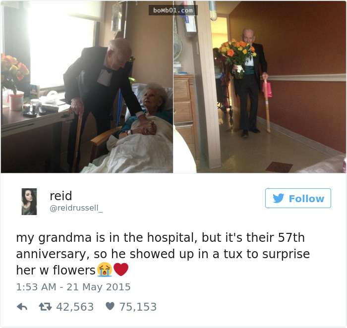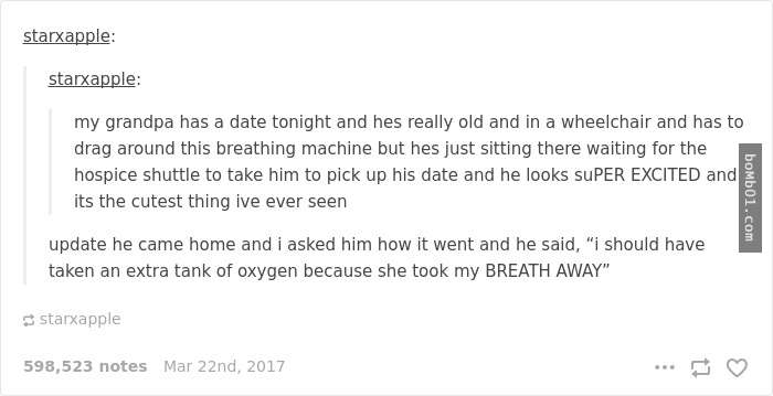 ▼「爺爺今晚去約會,他年齡很大了,還坐著輪椅,而且要把呼吸器拖著走。但他就坐在那裡,等待看護帶他去接約會對象。他看起來超級興奮,這是我見過最可愛的事。回家後我問他約會情況如何,他回答說:「我應該多帶一桶氧氣的,因為她讓我喘不過氣來。」」