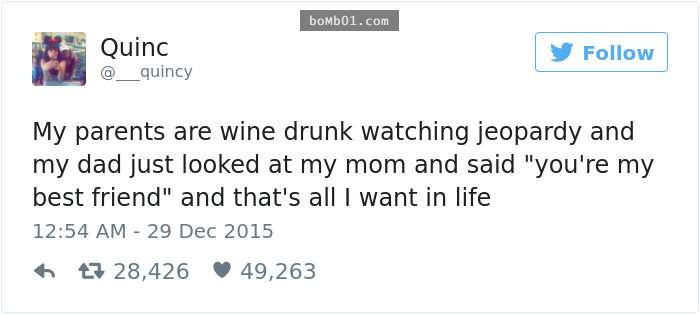 ▼「爸媽喝紅酒喝醉了,他們正在看《危險邊緣》,爸爸突然對媽媽說:「你是我最好的朋友!」 這就是我人生中想要的一切。」
