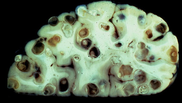 ▼這是一種很常見的寄生蟲,存在於沒有煮熟的豬肉內。牠雌雄同體,大概有7到13個子宮,150到200個睪丸,進入人體後會拼命繁殖。如果絛蟲卵囊進入腦部,成蟲會到處鑽孔,引發癲癇、失心瘋等可怕的症狀。