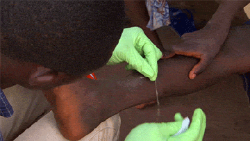 ▼這種寄生蟲的幼蟲生活在不乾淨的水源裡,被人們喝下肚後,大概過一年才會慢慢孵化。最後牠們會長成1公尺左右,像白麵條一樣的成蟲,還會在四肢的皮膚下鑽動,超級疼痛。想要將牠們取出來沒什麼好辦法,只能活生生抽取。
