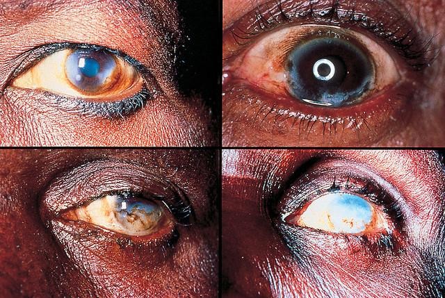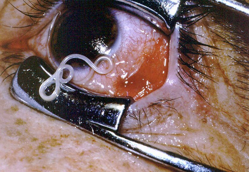 ▼這種寄生蟲活躍在非洲中西部的河岸區。被黑蠅叮咬的話,蟠尾絲蟲就可能藉著觸鬚進入人體。牠們會引發嚴重的發炎反應,導致皮下組織異常腫大。除此之外,牠們還會在眼角膜表面遊走,重複發炎結痂的話會導致「河盲症」,讓人永久失明。