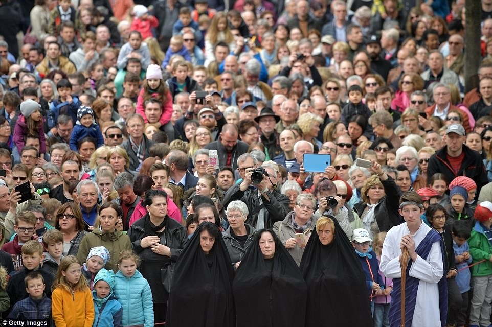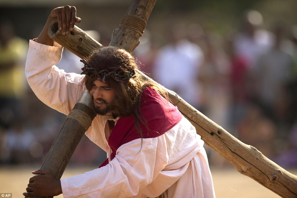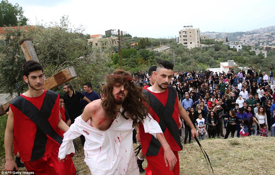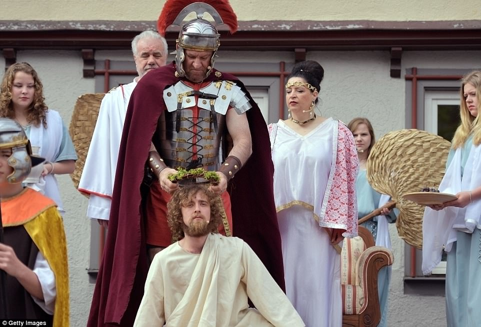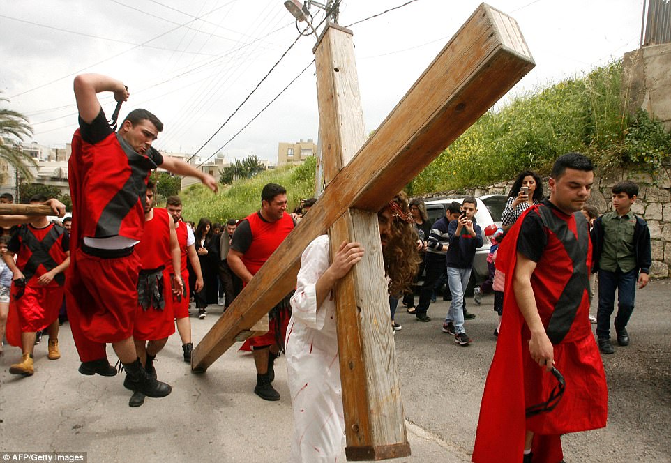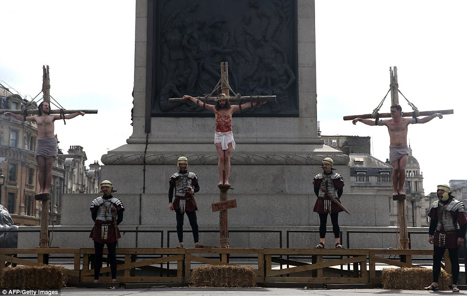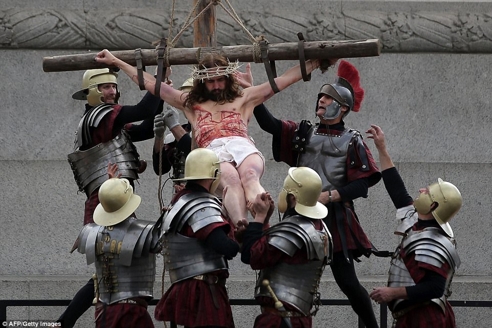 ▼​演員Julian Lux扮演耶穌,正在重演受難的一幕。