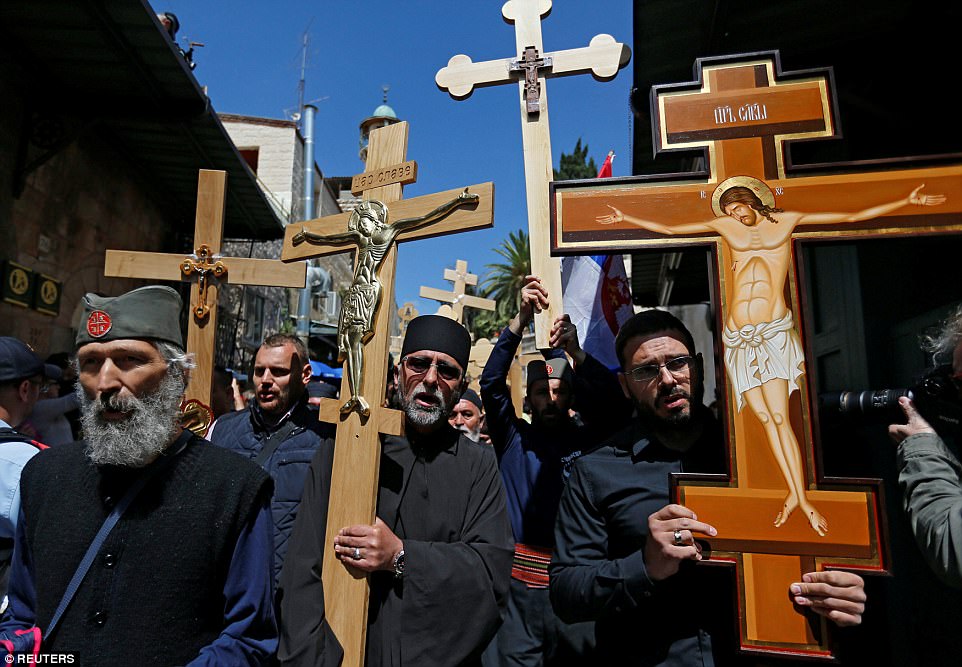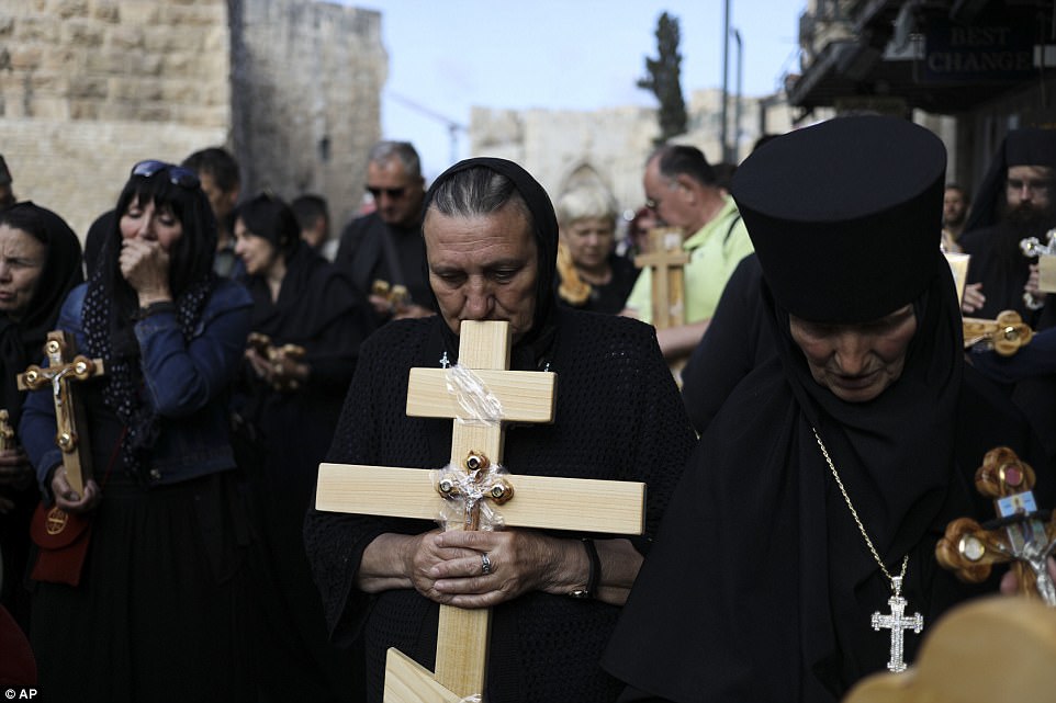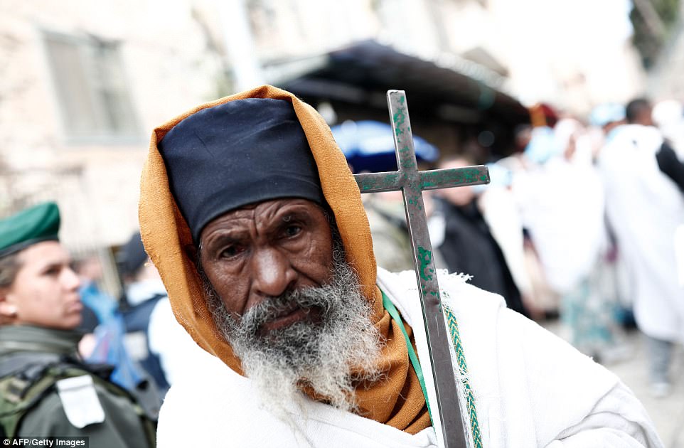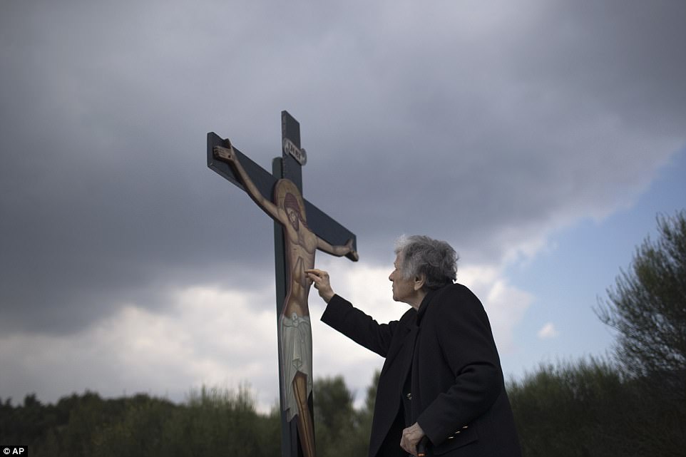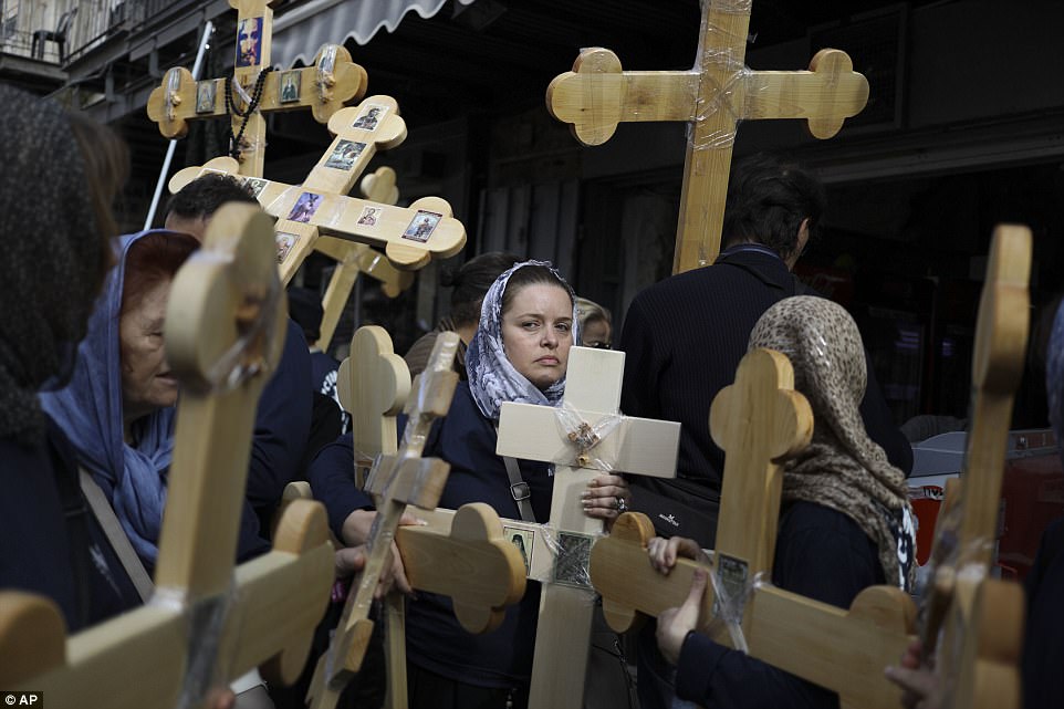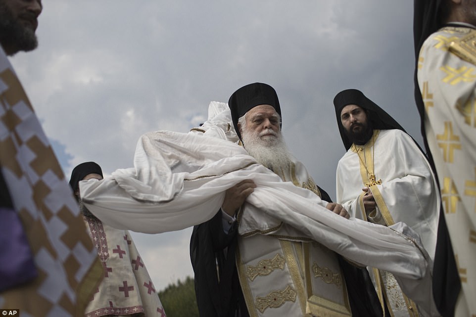 ▼​希臘牧師拿著十字架,在1587年建立的修道院附近舉行儀式。