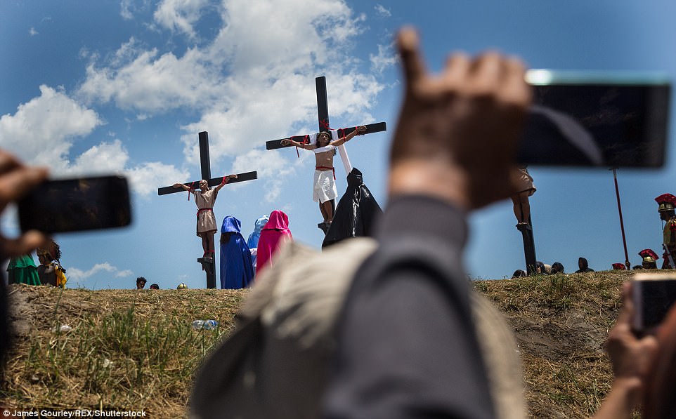 ▼這些人模仿耶穌基督的經歷,被釘在十字架上,還有人圍觀拍照。