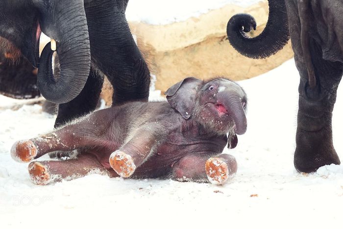 ▼幼像剛出生時平均體重為110Kg,高0.9米。在剛出生的三個月裡,牠們甚至無法控制自己的鼻子,還經常被鼻子絆倒,這顯得十分笨拙。