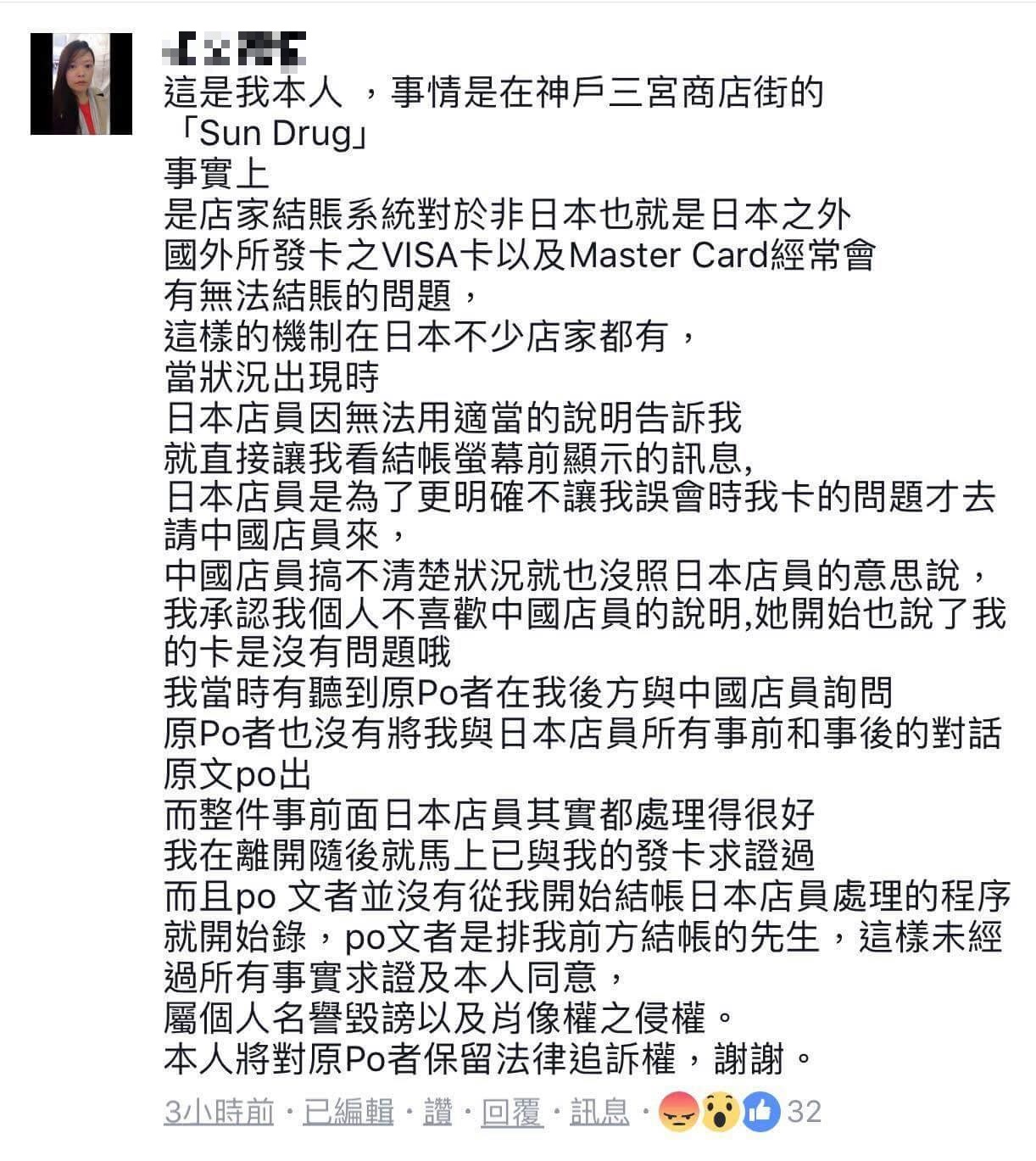 ▼影片在網路上發酵之後,有一名疑似當事人的女性在「日本自助旅遊中毒者」的不公開社團內發文對自己的行為做出解釋,表示中國店員搞不清楚狀況,還補了一句要對一開始po出影片的網友提告!