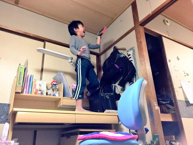 ▼兒子回到房間後看到這份禮物,簡直高興到飛起,忍不住跳到了桌子上歡呼。
